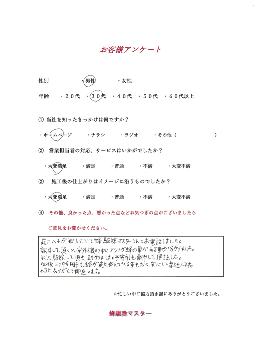 庭にハチが飛んでいて蜂駆除マスターさんにお電話しました。調査して頂くと室外機の中にアシナガ蜂の巣がある事が分かりました。すぐに駆除して頂き、助かりました。予防剤も散布して頂きました。その後、三ヶ月時点も蜂が庭に飛んでくる事もなく安心して暮らせてます。本当にありがとう御座います。