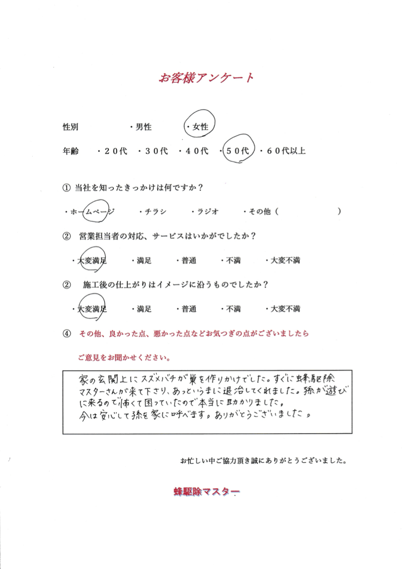 家の玄関上にスズメバチが巣を作りかけでした。すぐに蜂駆除マスターさんが来てくださり、あっという間に退治してくれました。孫が遊びに来るので怖くて困っていたので本当に助かりました。今は安心して孫を家に呼べます。ありがとうございました。