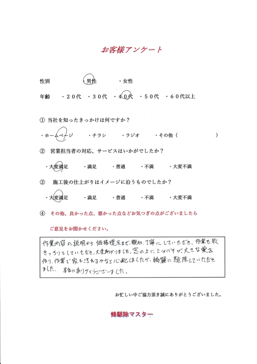 作業内容の説明から価格提示まで、親切・丁寧にして頂き、作業も早くきっちりとしていただき、大変助かりました。窓の上にミツバチが大きな巣を作り、作業で家も汚れるかなと心配しましたが、綺麗に駆除して頂きました。本当にありがとうございました。