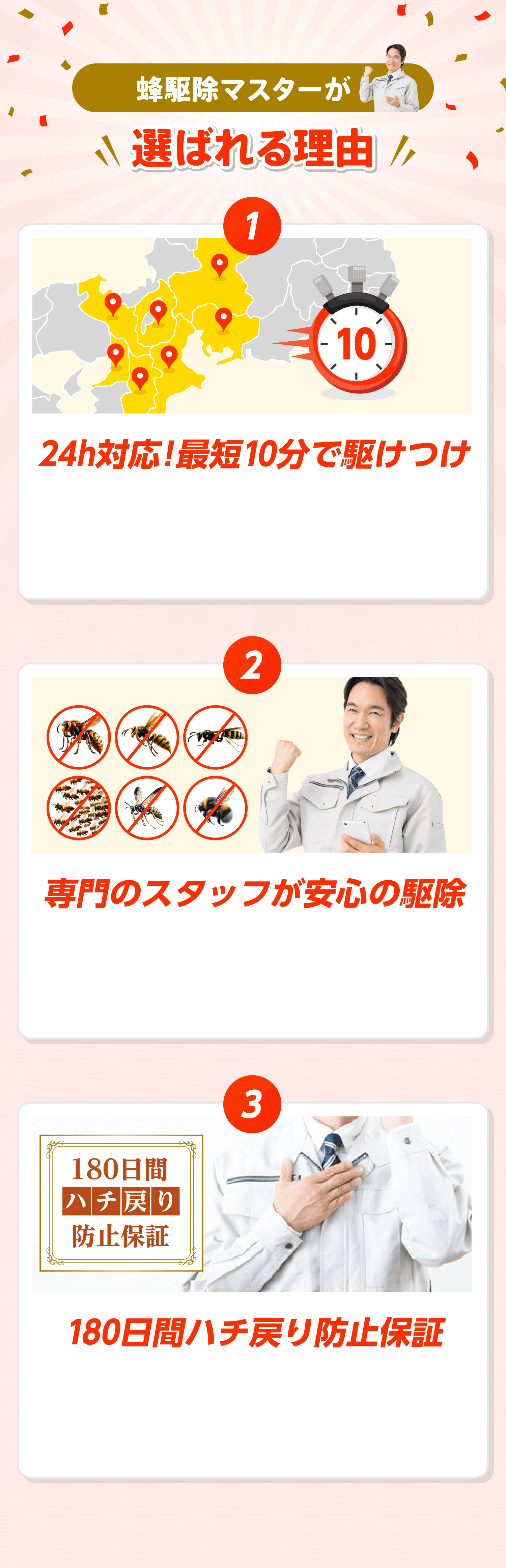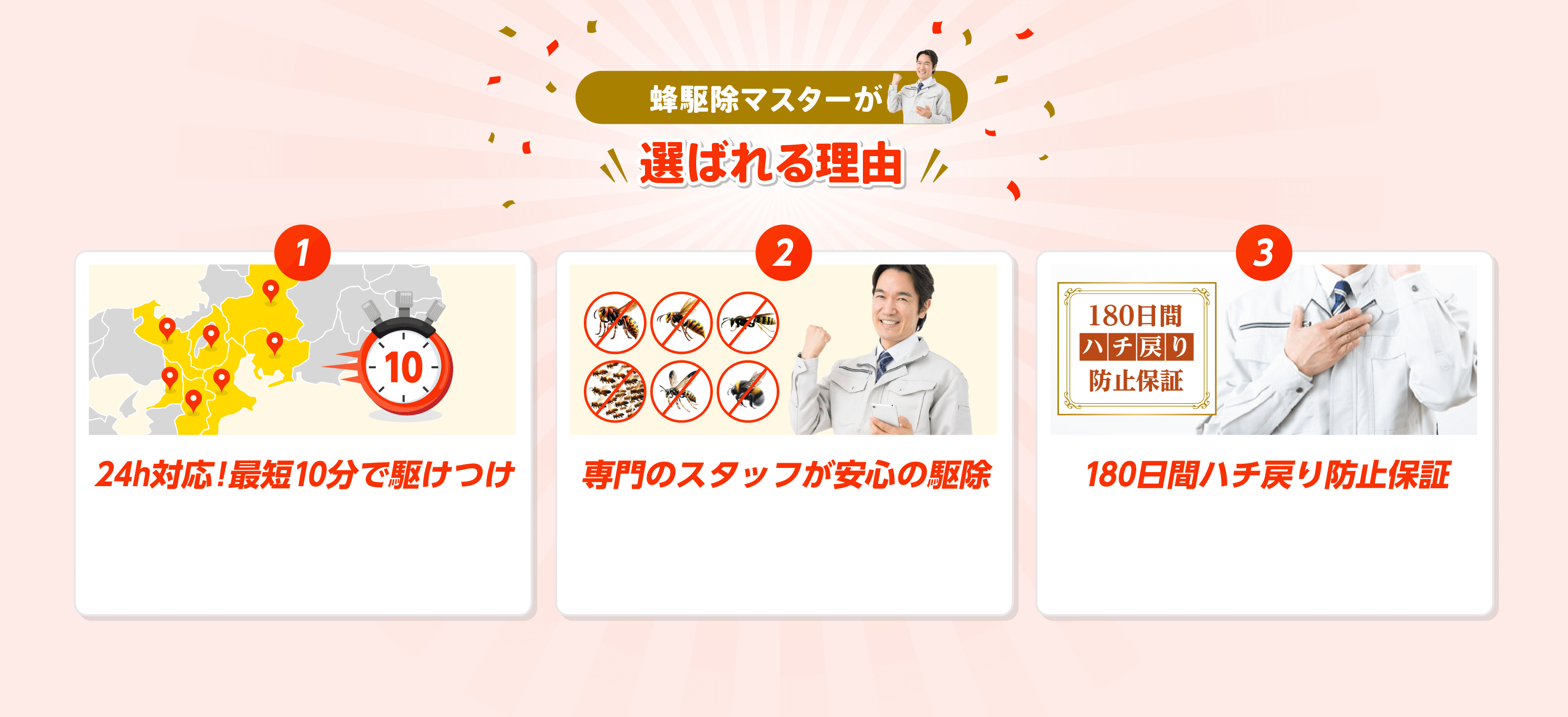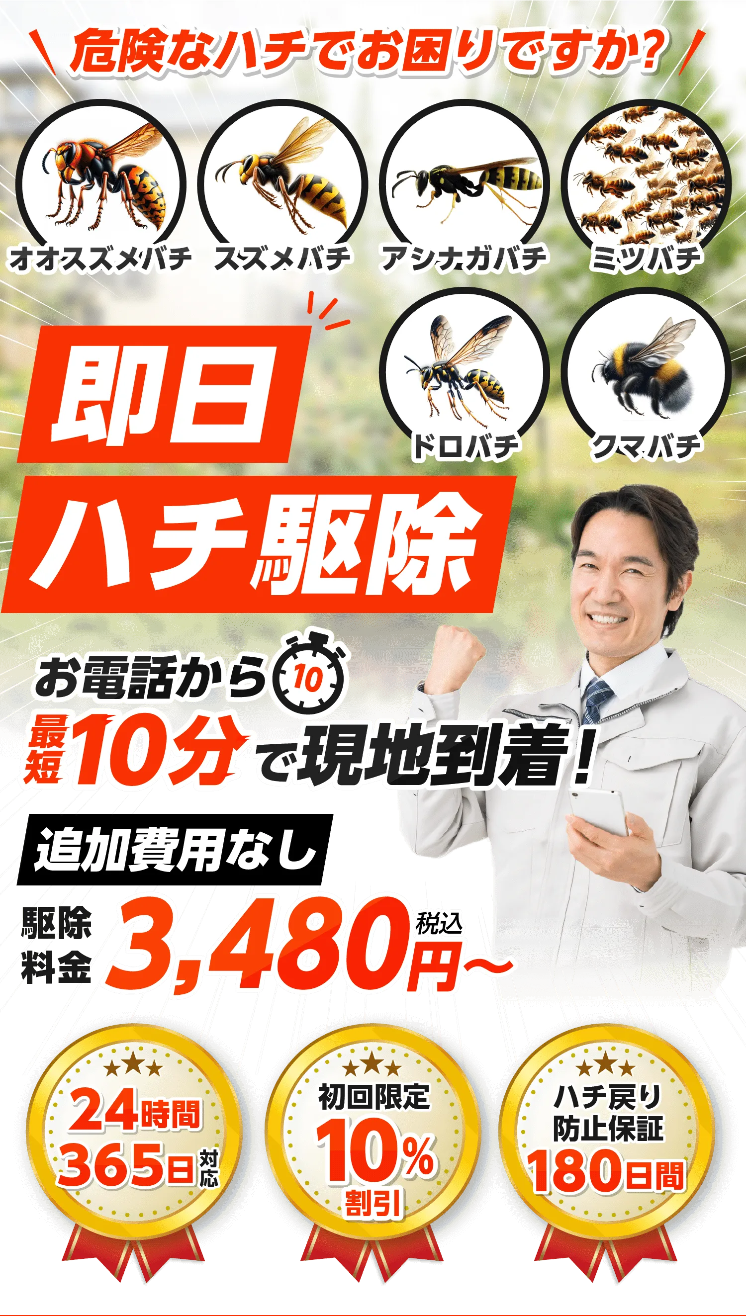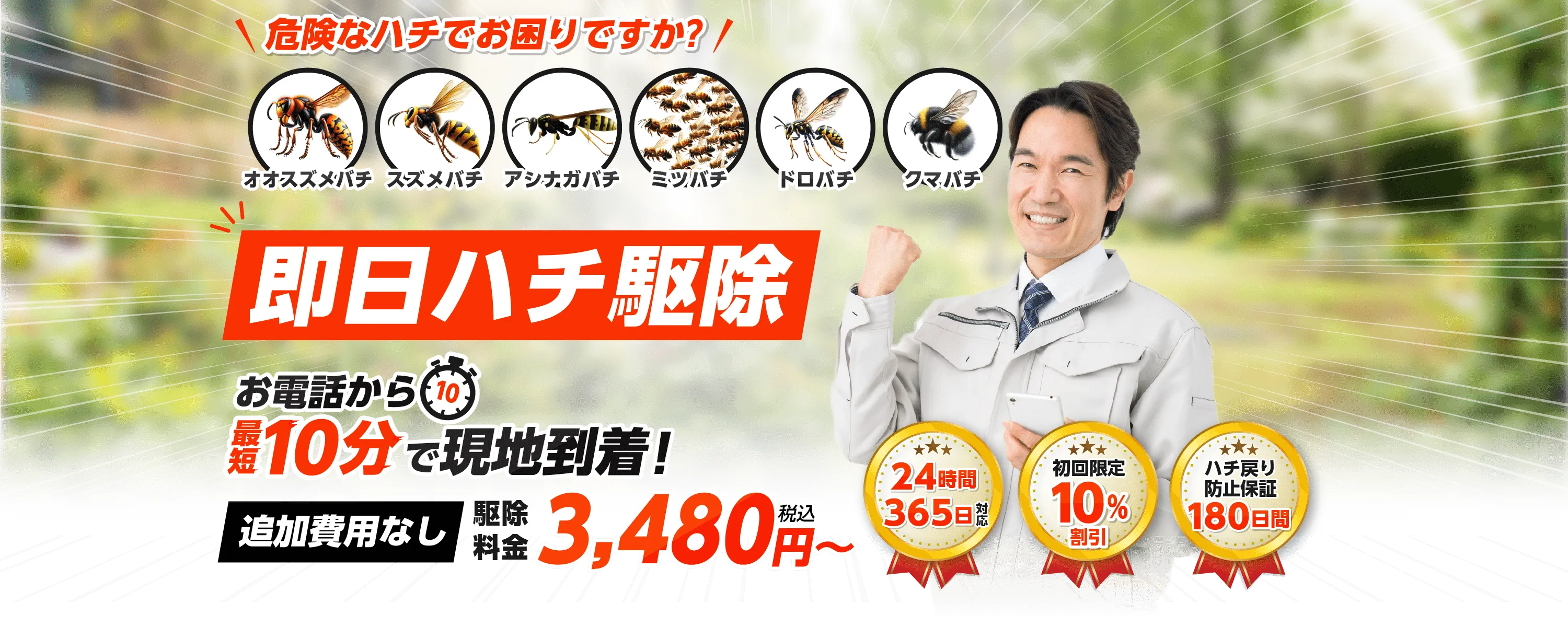 関西・東海の7府県のハチの巣トラブルに、素早く対応。急なハチの出現でも、電話一本で最短10分で到着します。